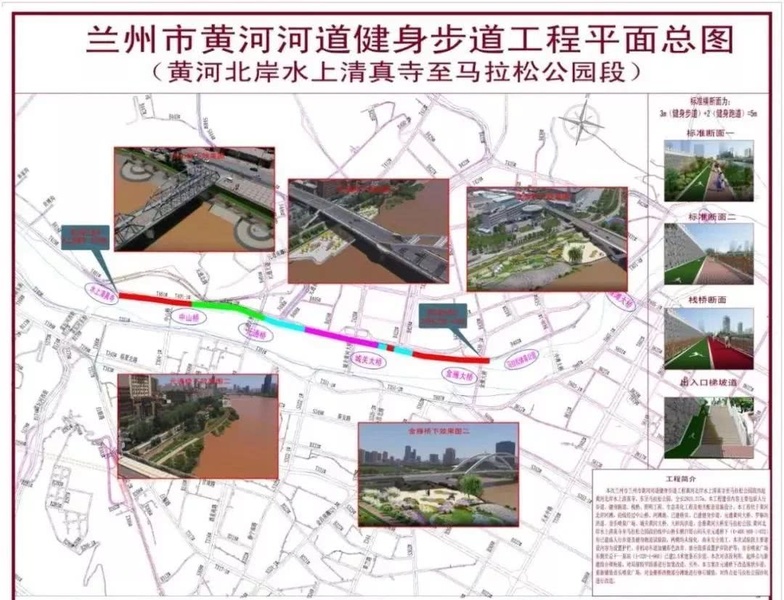 蘭州市黃河河道健身步道工程(黃河北岸水上清真寺至馬拉松公園段)位于黃河北岸河灘,全長2924.317米,西起黃河北岸金城關古建一條街水上清真寺,沿途經過中山橋、元通黃河大橋、羅鍋溝洪道、音樂噴泉廣場、城關黃河大橋、大砂溝洪道、金雁黃河大橋至馬拉松公園。主要建設內容包括人行步道、健身跑道、棧橋、照明工程、生態美化工程、相關配套設施及中山橋、元通大橋、金雁大橋下和音樂噴泉廣場節點景觀改造。