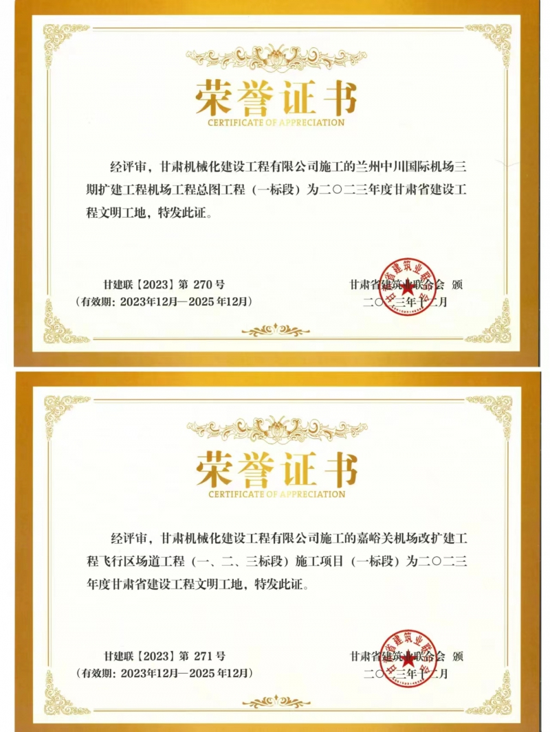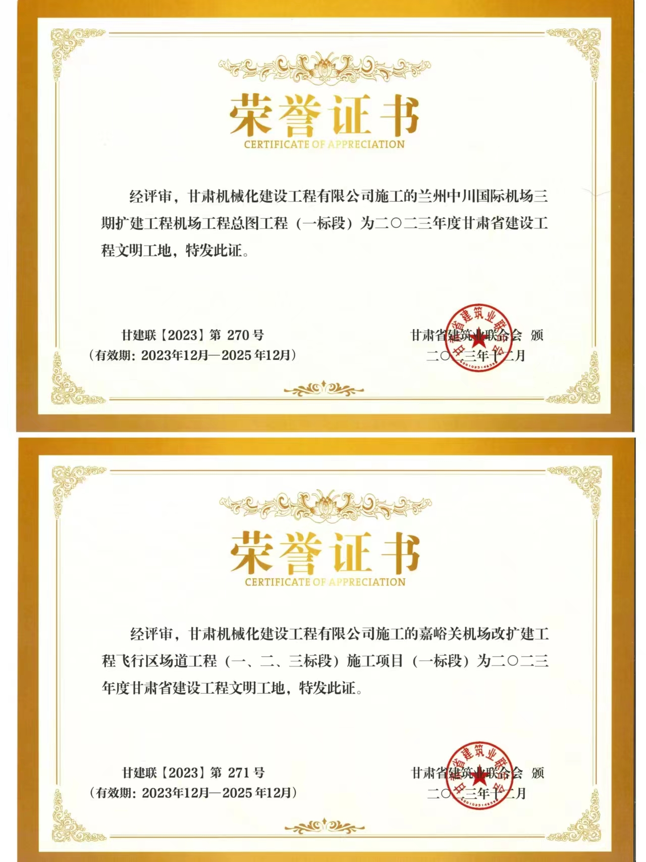 近日,我司承建的蘭州中川國際機場二期擴建工程機場工程總圖工程 (一標段)與嘉峪關(guān)機場改擴建工飛行區(qū)場道(一、二、三標段) 施工項目 (一標段) 獲得2023年度甘肅省建設(shè)工程文明工地榮譽稱號。