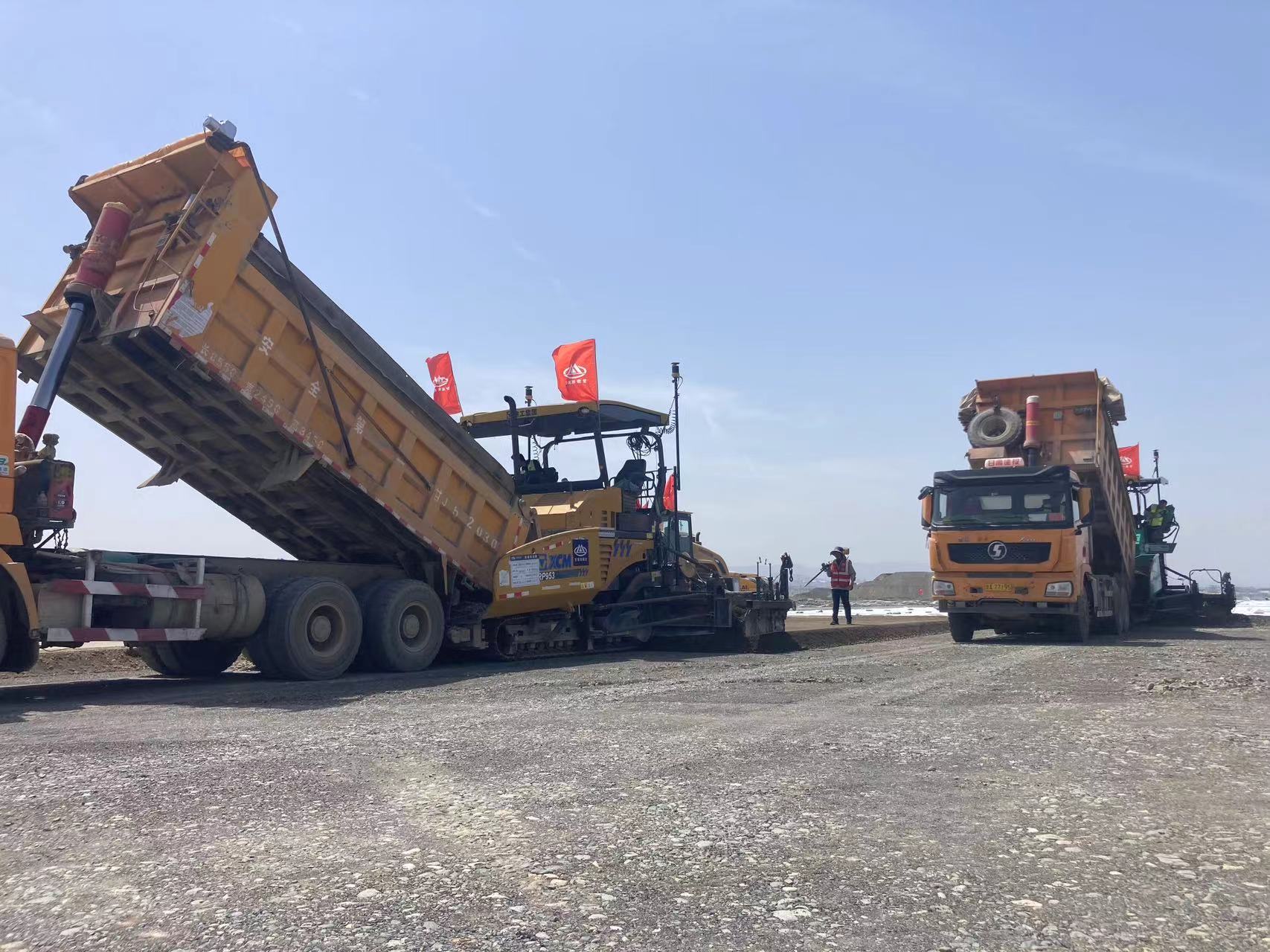 為保證攤鋪順利進行,項目部前期做好各項準備工作,在施工過程中,嚴格把控施工環(huán)節(jié),確保攤鋪施工銜接有序,高效優(yōu)質(zhì),一次成型,并使用mmGPS 3D攤鋪技術進行兩機聯(lián)鋪。